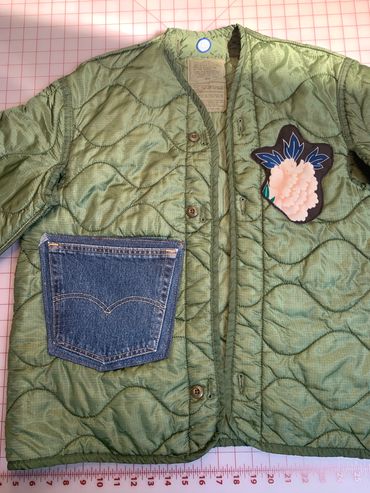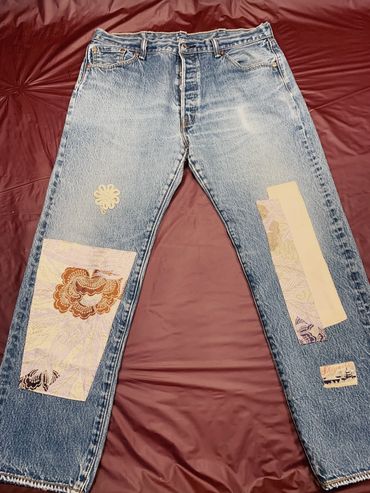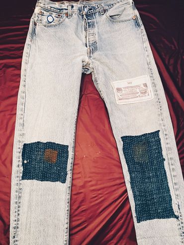 Our team inspects the denim for an opportunity to up-cycle our garments. The jeans are then cleaned with an eco-friendly soft water solution as to not further damage them. We then use our creativity to reconstruct and redesign the fabric utilizing principles tied to Sashiko stitching, silk kimono’s and other materials we choose. We then review the garment and add any final touches that will make the jeans unique to all others.